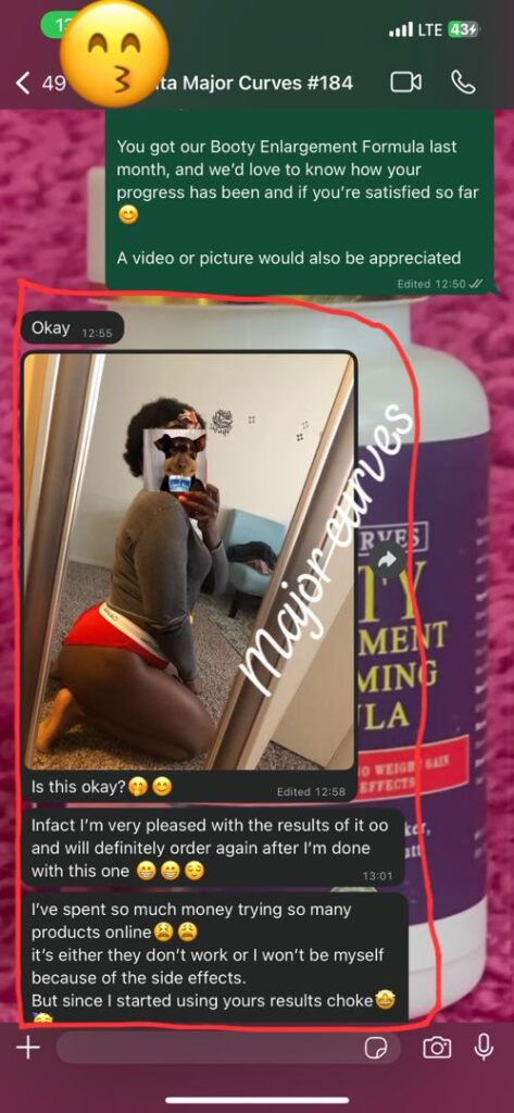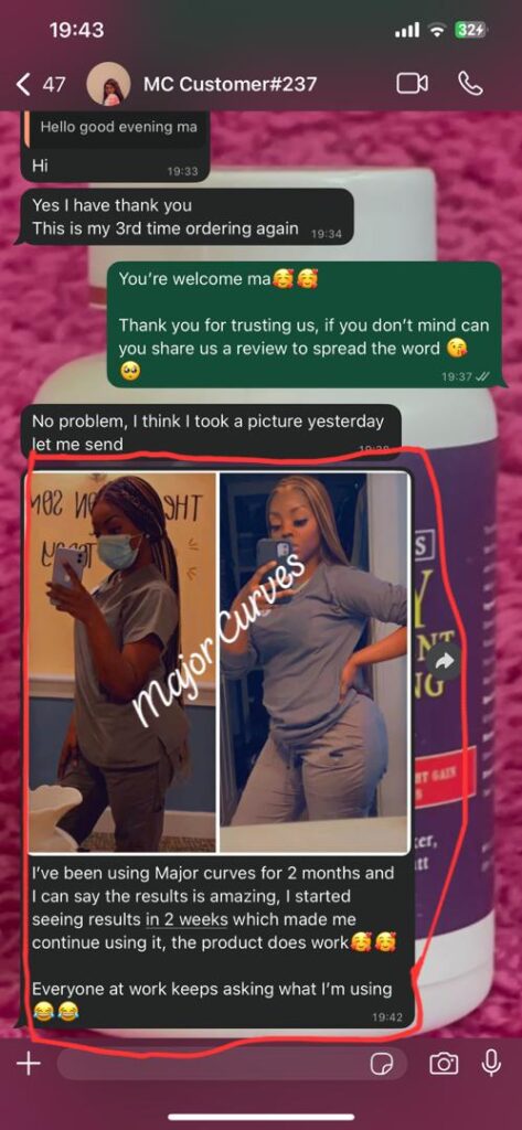 People always used to say I’m thick but no yansh 😭. I’ve tried almost everything before, either it didn’t work or I just ended up getting fat. But Major Curves shocked me o. My hips started coming out small small, and my ass lifted nicely without my tummy changing. Now everyone’s just asking what I’m using.”