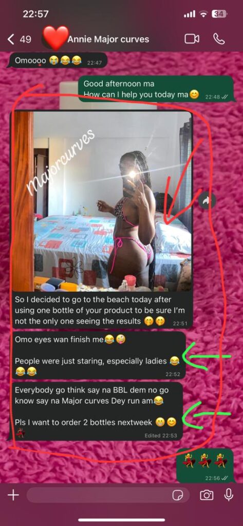 People used to joke about my flat yansh all the time. I laugh it off, but e dey pain me inside. I decided to try Major Curves just to see if it really works, and omo, I’m shocked. My shape began to change completely! Now those same people dey ask if I went for surgery. This product is pure magic!